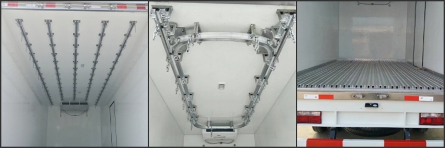 1、肉鉤冷藏車在生產過程中廂體必須加固,根據廂體大小可選擇3條、4條、5條導軌。